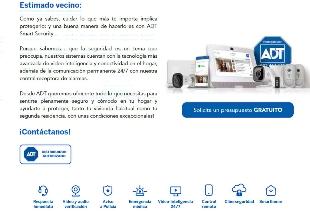 El servicio de alarmas es mediante el proveedor ADT (Tyco Integrated Security, S.L.U) es una empresa de Seguridad Autorizada por el Ministerio del Interior e inscrita en el Registro Nacional de Seguridad Privada con el Nº 2817